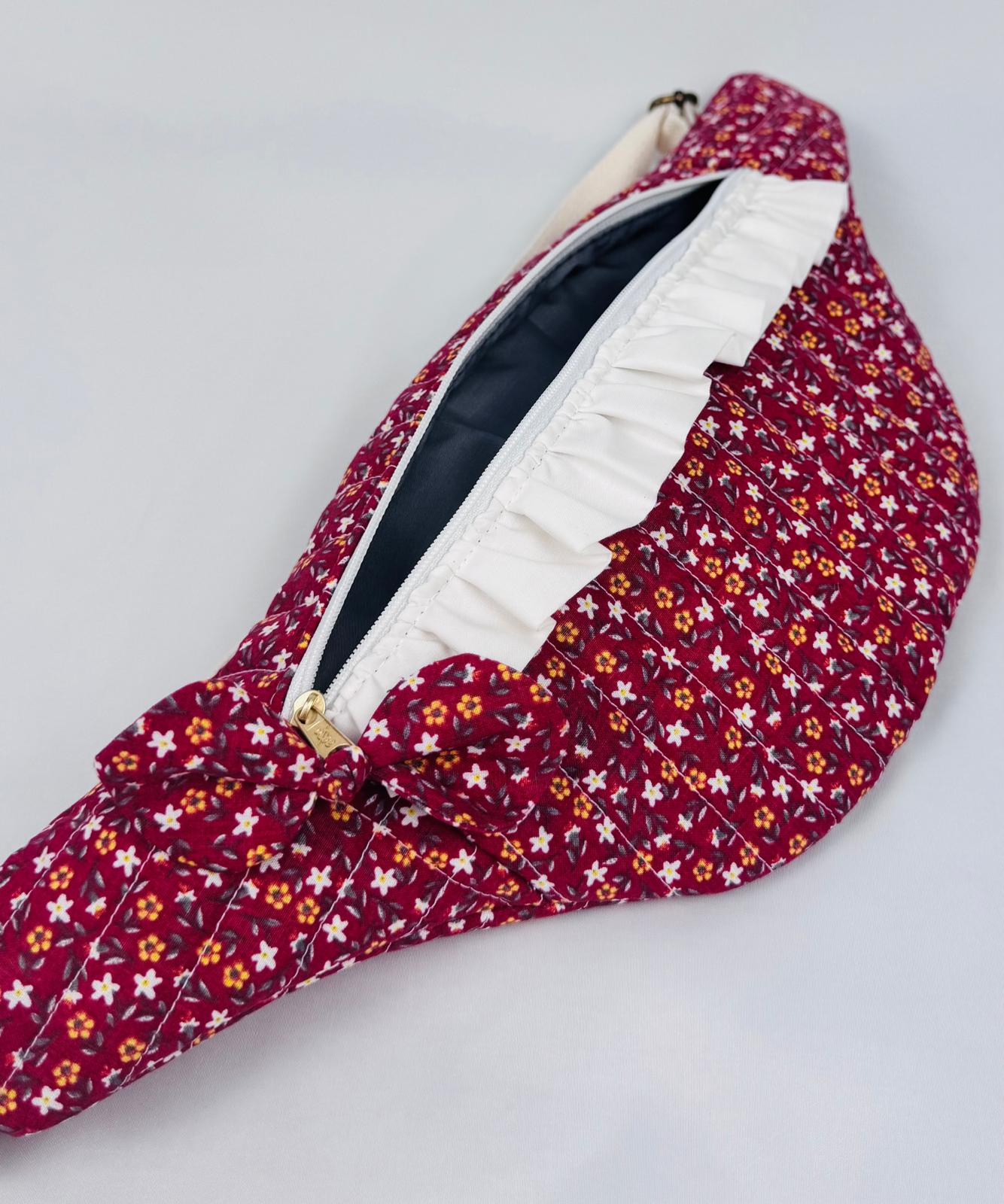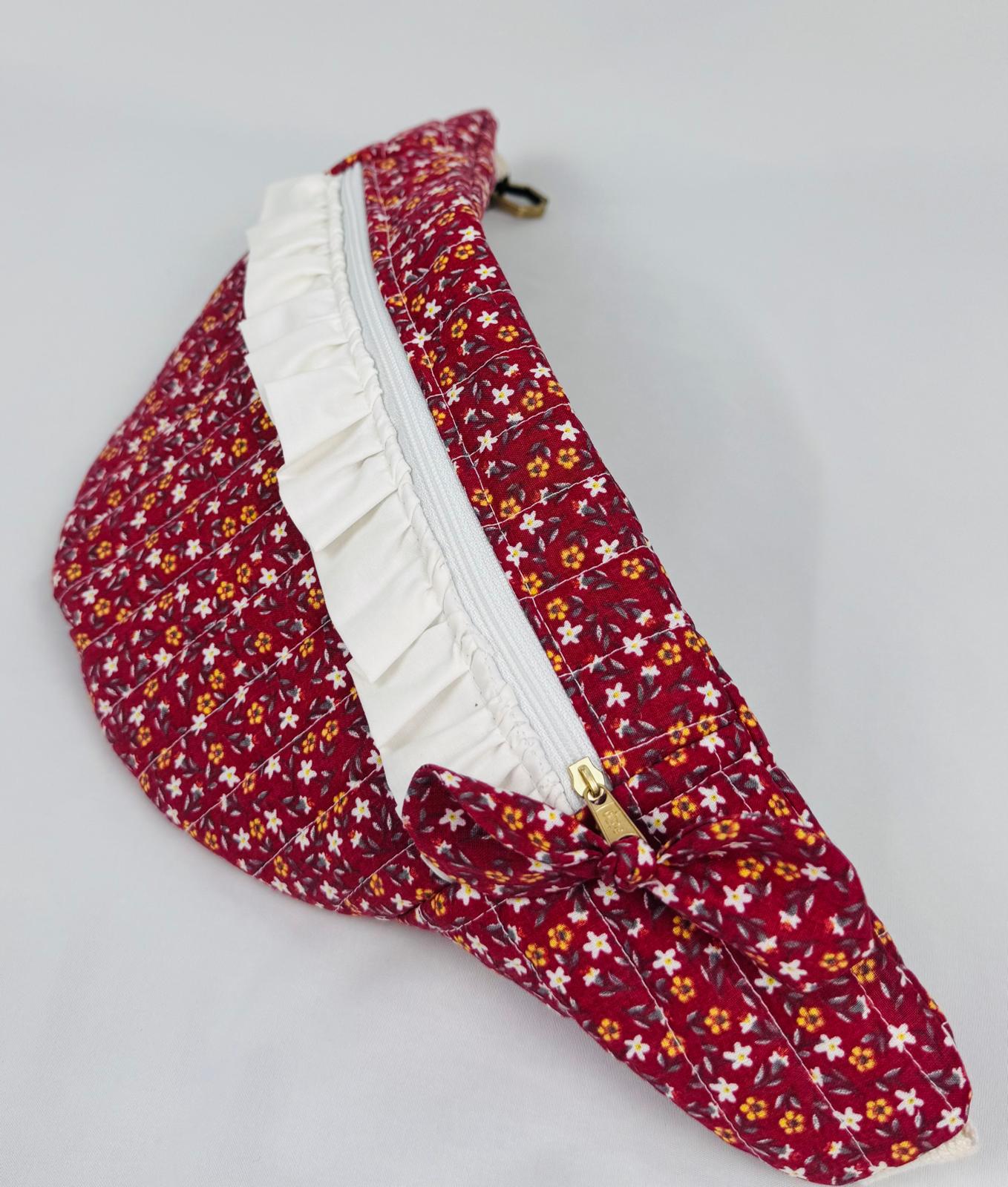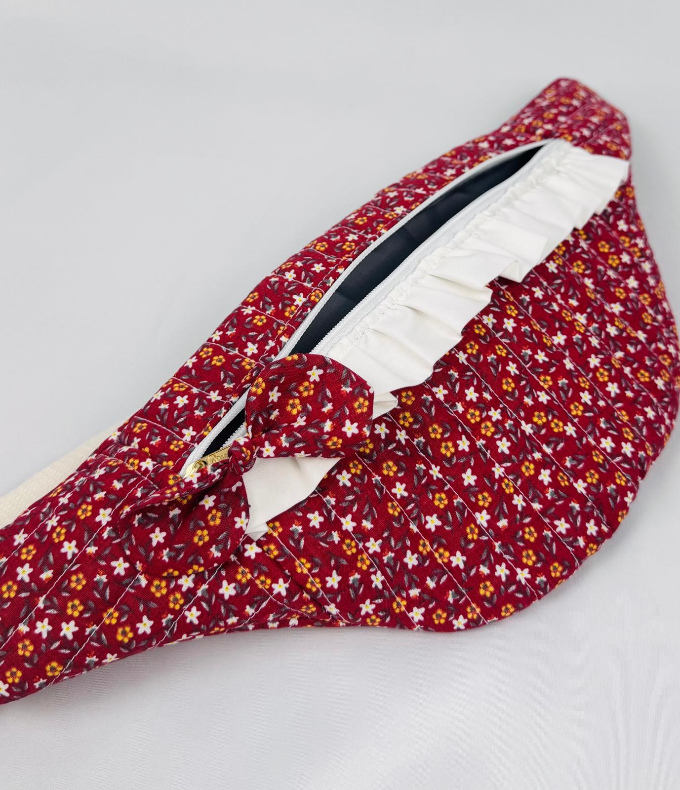 Rosita é uma pochete feita à mão, com todo o cuidado e atenção ao detalhe. Confeccionada em tecido acolchoado com padrão floral vermelho e pequenos apontamentos amarelos e brancos, é rematada com um delicado folho branco e um laço lateral que lhe dá um toque ainda mais especial.